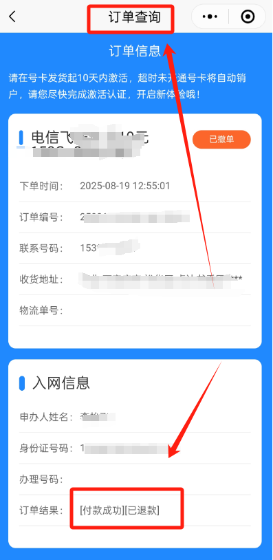 4、用户可以自行在172号卡H5查询订单页面申请退款,后台审核操作同意或拒绝