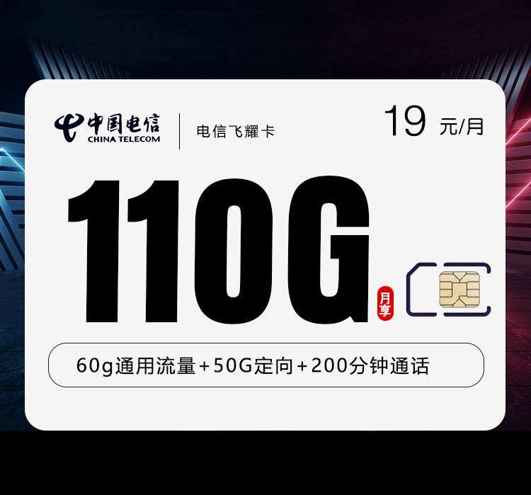 电信飞耀卡【19元110G+200分钟】——172号卡官方一级佣金60元