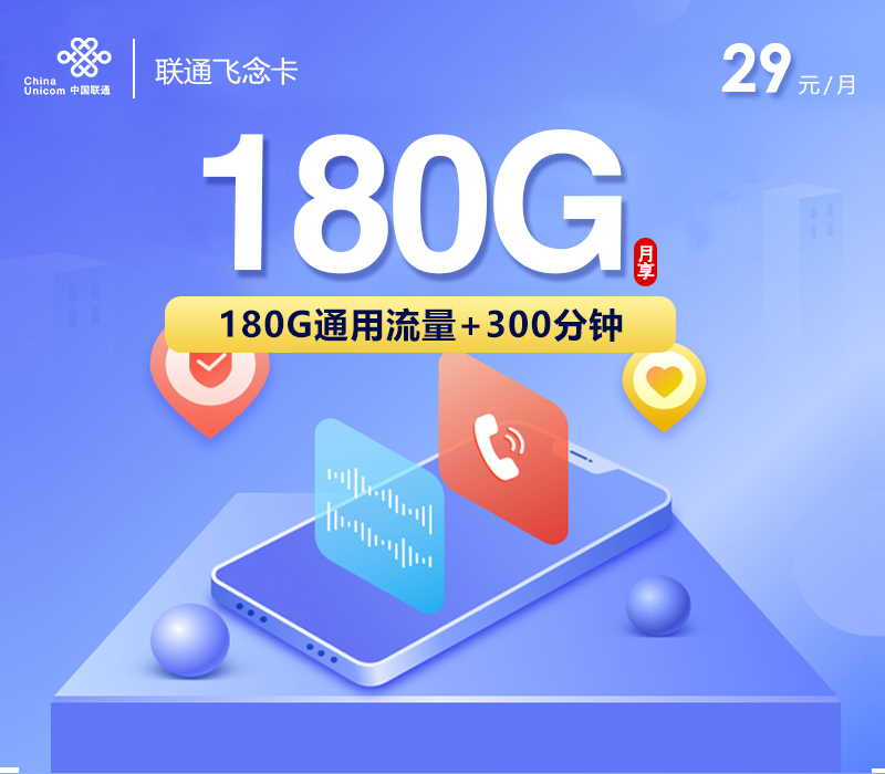 联通飞念卡【29元180G+300分钟】——172号卡官方一级佣金100元